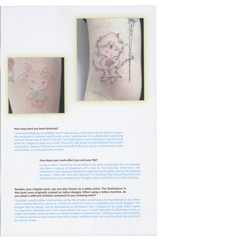 Nuseahe은 작가 이해선의 「문신을 위한 그림」으로 그간 모아왔던 누군가의 몸에 새겨질 수 있는 89개의 작은 그림들이 담겨있다. 이해선은 일상과 습관의 기억 속 어디쯤에서 상상으로 연결되는 몽상적인 그림을 표현한다. Nuseahe 속 그림은 그간 종이 위의 강하고 날렵한 모습과는 다른 작고 섬세한 태도가 반영되었다.이 책은 그림과 자신에 관해 출판사와 나눈 짧은 사담이 실려있습니다.